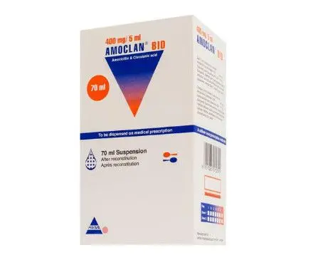 Amoclan BID 400mg/5ml is a pediatric oral suspension containing amoxicillin 400mg and clavulanic acid 57mg per 5ml, a combination antibiotic for treating bacterial infections.